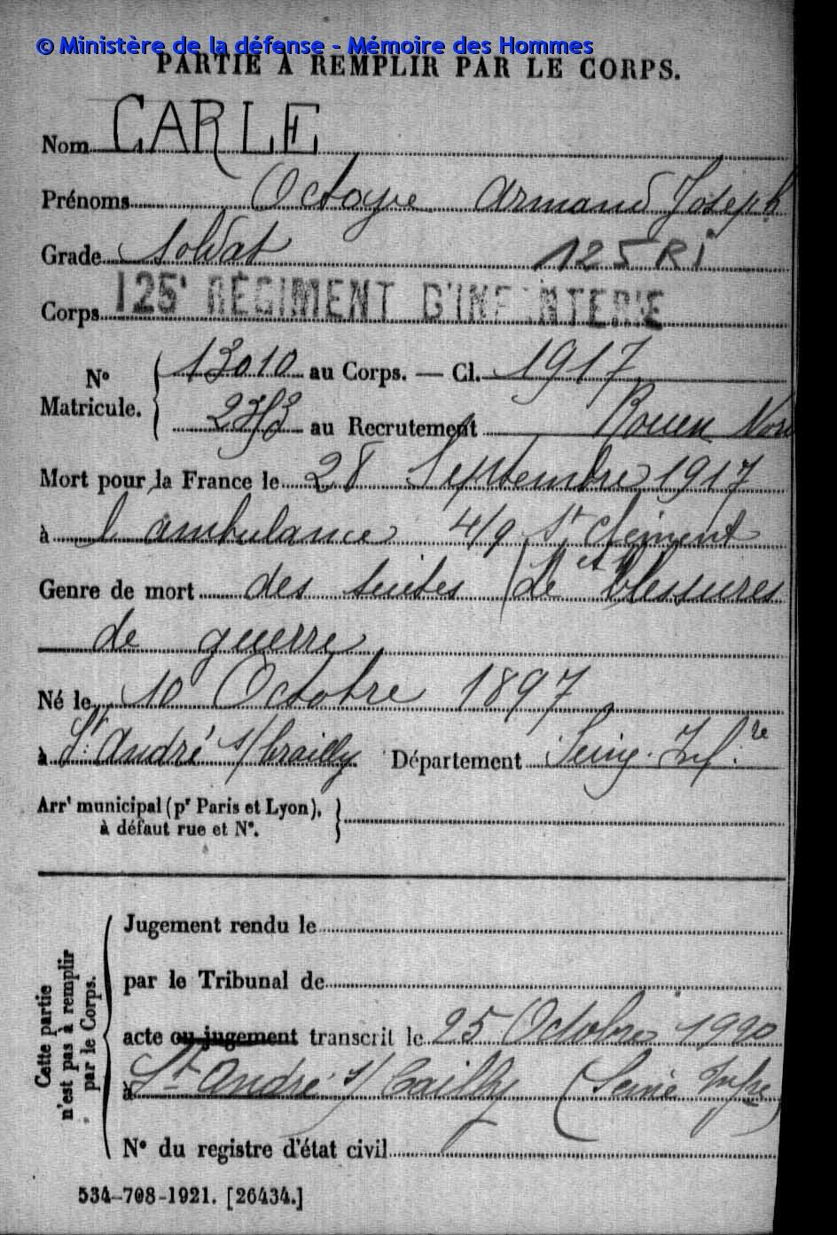 Mais l'Histoire frappe durement. Octave, l'aîné, né en 1897, soldat au 102e régiment d'infanterie, meurt à 19 ans le 28 septembre 1917 à Saint-Clément, en Meurthe-et-Moselle. Grand garçon aux yeux bleus, 1m67, front haut, visage ovale — son signalement militaire en fait un portrait rapide.